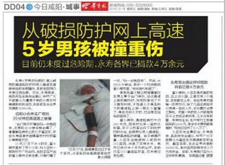 2015年11月27日下午,永寿5岁男孩玩耍时,竟从破损的高速路防护网进入高速车道被疾驰的车辆撞伤,目前仍在医院接受治疗。对此,永寿县委、县政府在全县发出倡议,呼吁广大干部群众为遭遇不幸的...[详细]