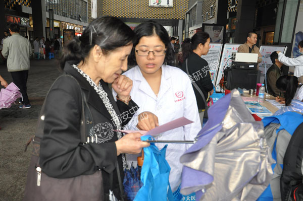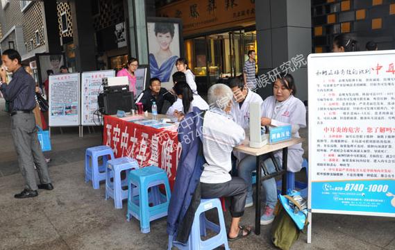 昨日,由西安市新城区卫生局牵头举办的“服务百姓健康行动”大型义诊活动在西安市解放路万达广场举行。以西安中大耳鼻喉医院为代表的西安市17个医疗机构的200多名医务人员走上街头,冒雨为上千名市民进行健康查体和疾病宣传。随后一周内,义诊活动将下乡镇、基层,把健康服务送到百姓家门口。