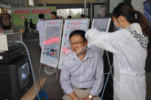 瓢泼大雨,并未浇灭卫生系统医务人员义诊的热情。昨日一早,在万达广场的屋檐下,西安中大耳鼻喉医院的义诊阵容,吸引了附近的居民。记者在现场了解到,除了可以量血压和测血糖等常规项目外,西安中大医生在现场为居民开展耳鼻喉内窥镜检查等项目,并为市民现场宣教耳鼻喉日常保健知识。