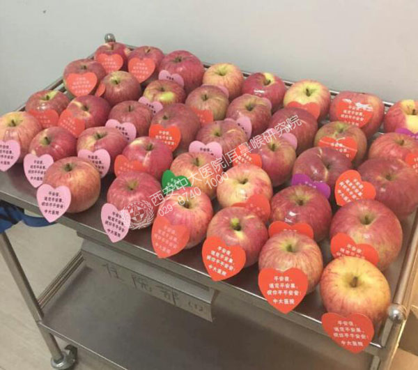 圣诞节前一天晚上,24日晚又叫平安夜,送苹果有平平安安,团团圆圆的寓意。苹果是圆的,象征着祝福人家团圆幸福的意思。苹字谐音平,即平安的意思!西安中大耳鼻喉医院为给患者送去平安祝福,精心挑选大批苹果,打好精美的包装。院长、病区主任和护士长亲自来助阵,把平安果亲自送到每一位患者手中,祝福每一位患者能够平平安安、早日恢复健康!