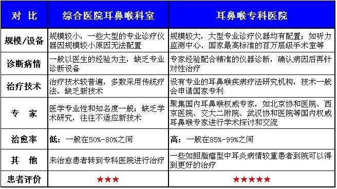 综合医院耳鼻喉科室与耳鼻喉专科医院各方面对比情况