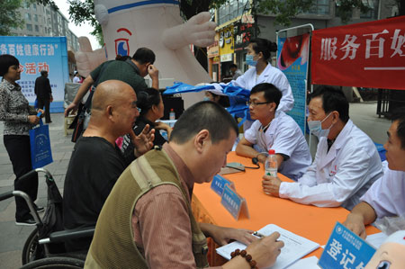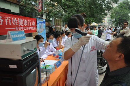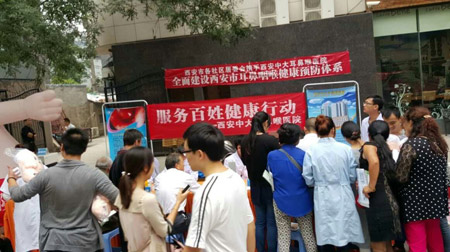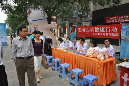 以西安中大耳鼻喉医院为代表的西安市17个医疗机构的200多名医务人员走上街头,为上千名市民进行健康查体和疾病宣传。