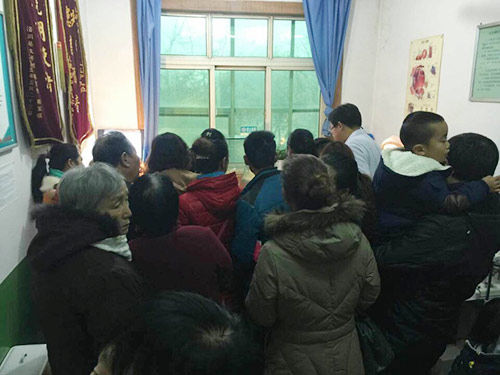 延安洛川县凤栖镇卫生院会诊现场,人群汹涌如潮,会诊室,甚至走廊外早已水泄不通。张全安教授在众多患者的围拥之下,依然表现得耐心细致,冷静严谨,丝毫没被周围环境所影响,而是以眼前患者为重。