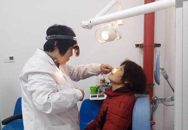 来长荣教授正在检查鼻窦炎患者情况